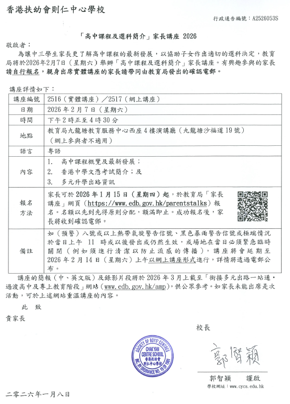 「高中課程及選科簡介」家長講座 2026