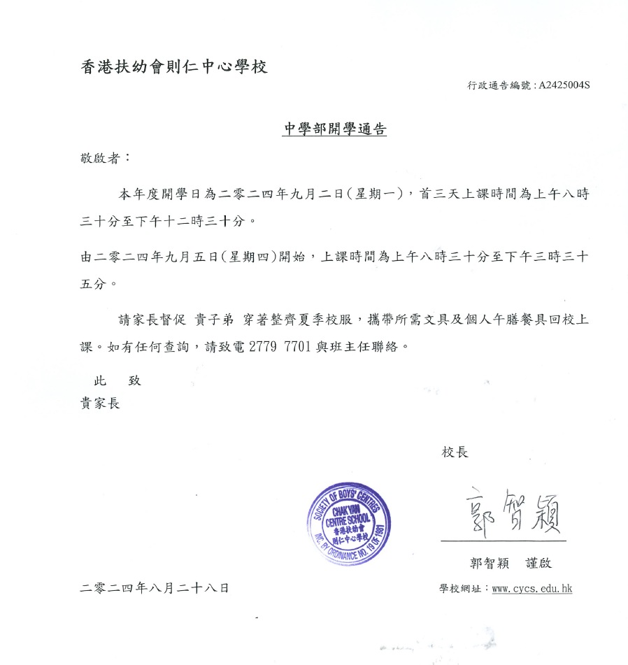 中學部開學通告