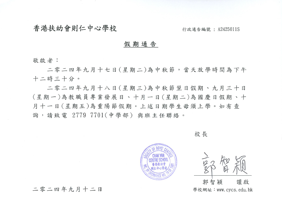 中秋、國慶、重陽假期(中學部)