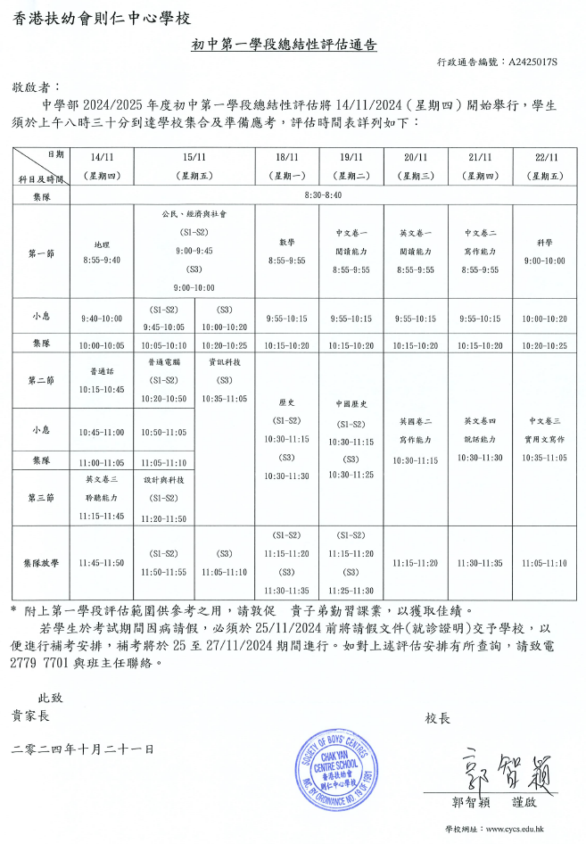 初中第一學段總結性評估通告