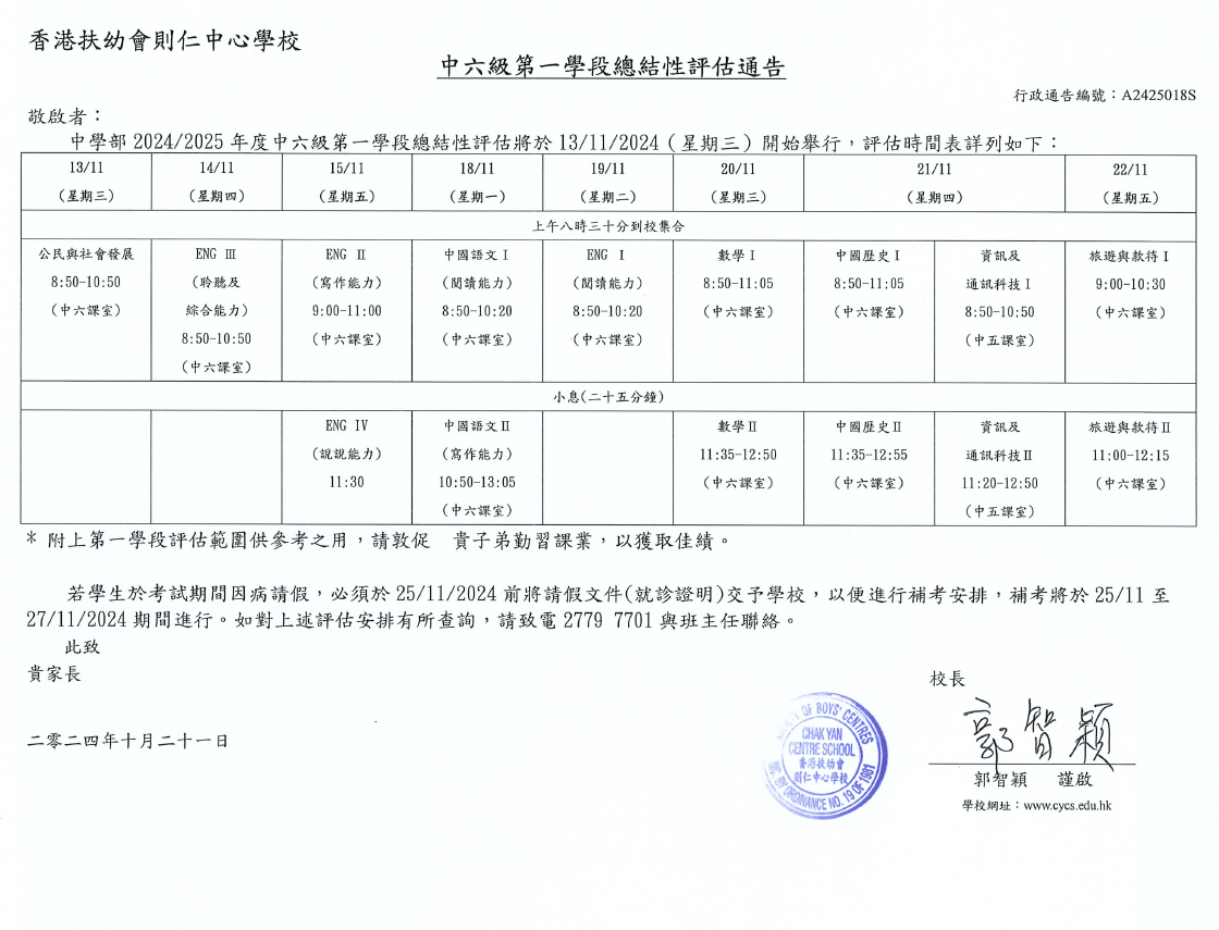 中六級第一學段總結性評估通告