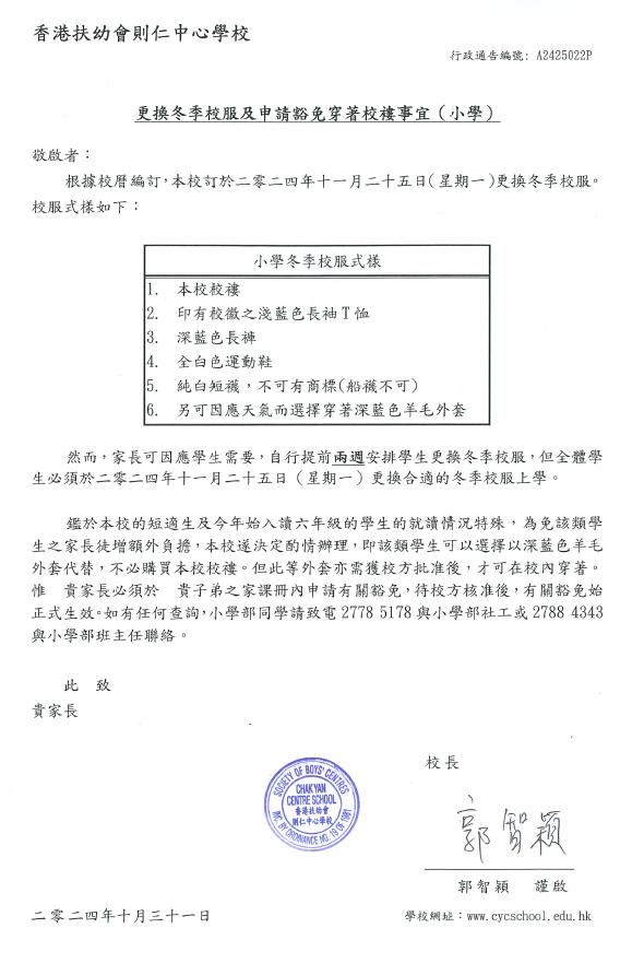 更換冬季校服及申請豁免穿著校褸 (小學)