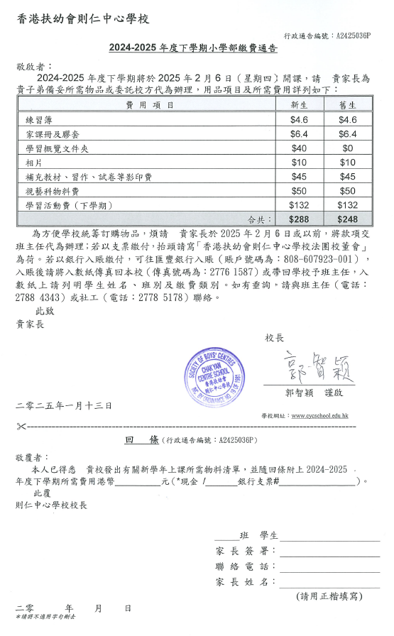 2024-2025年度下學期小學部繳費通告
