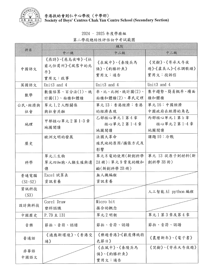 初中第二學段總結性評估通告