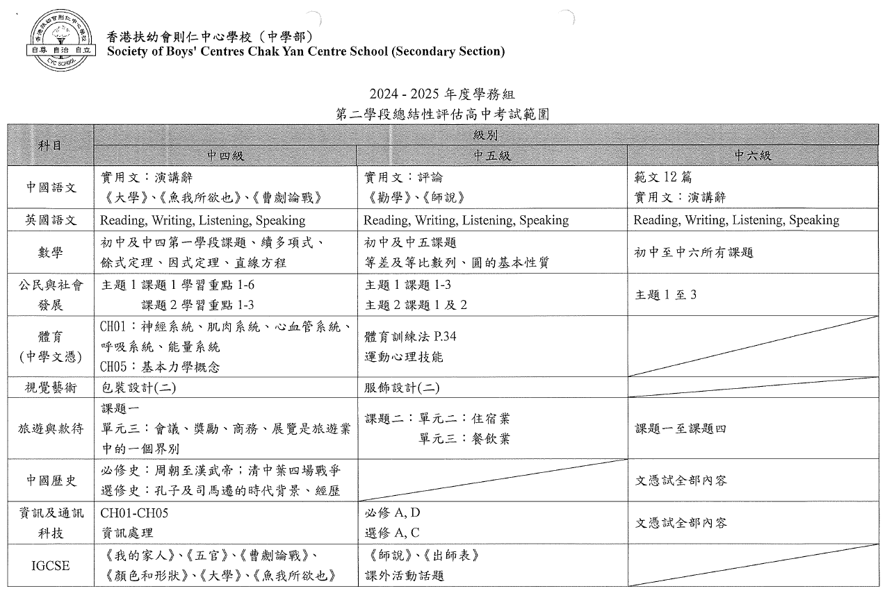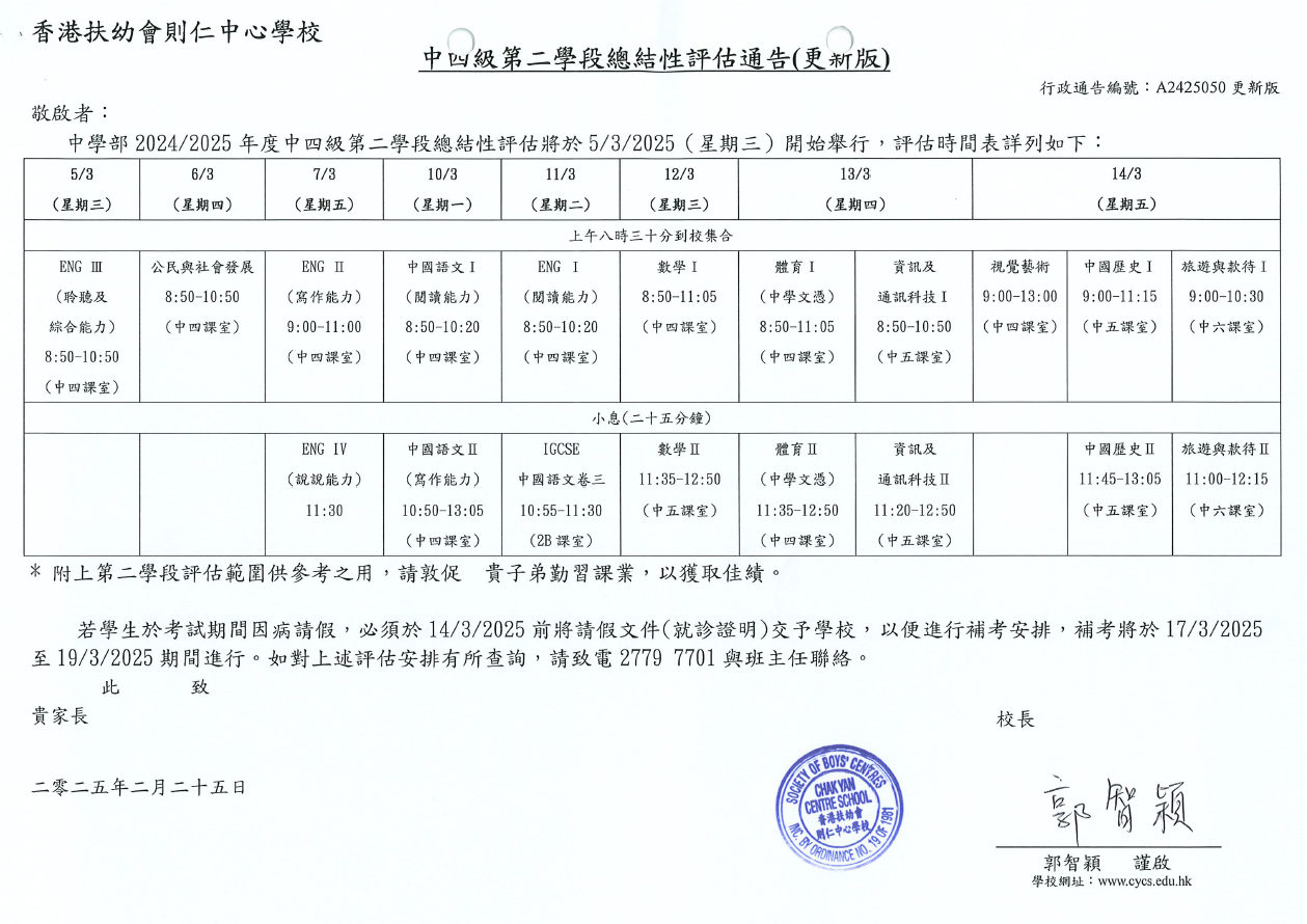 中四級第二學段總結性評估通告(更新版)