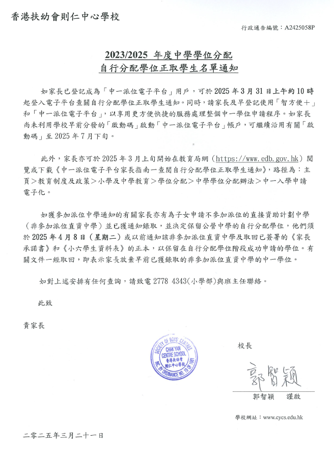 2023/2025 年度中學學位分配 自行分配學位正取學生名單通知