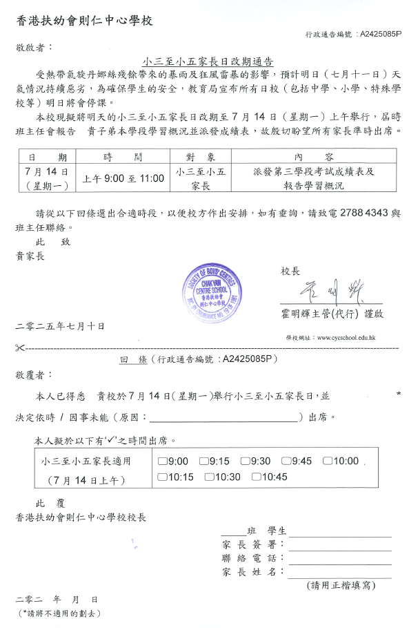 小三至小五家長日改期通告