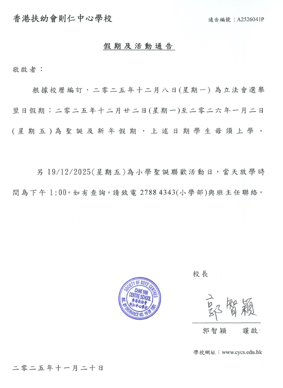 聖誕及新年假期(小學部)