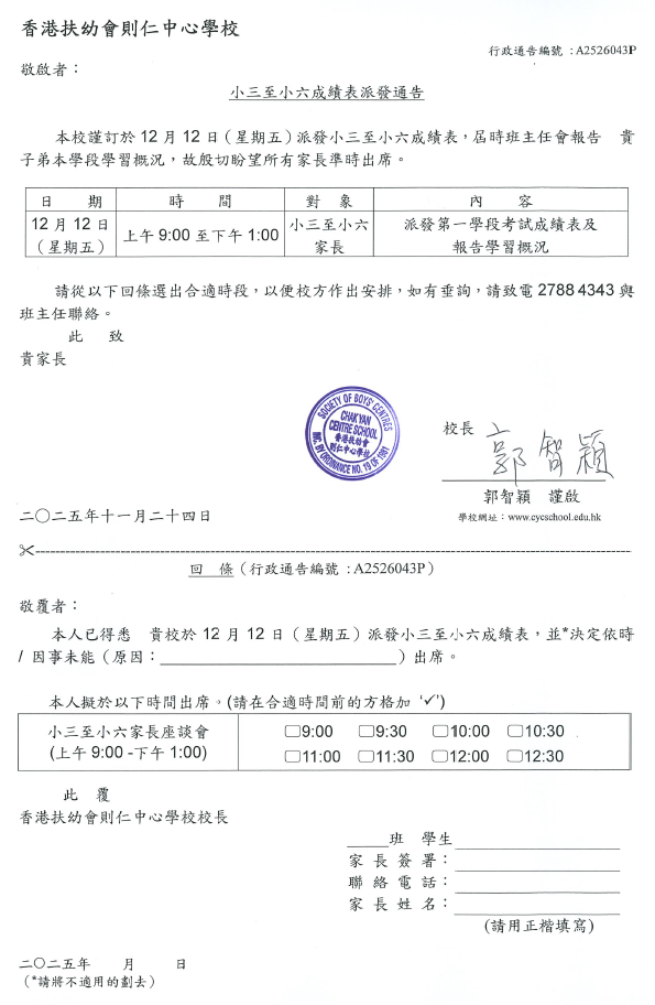 小三至小六成績表派發通告