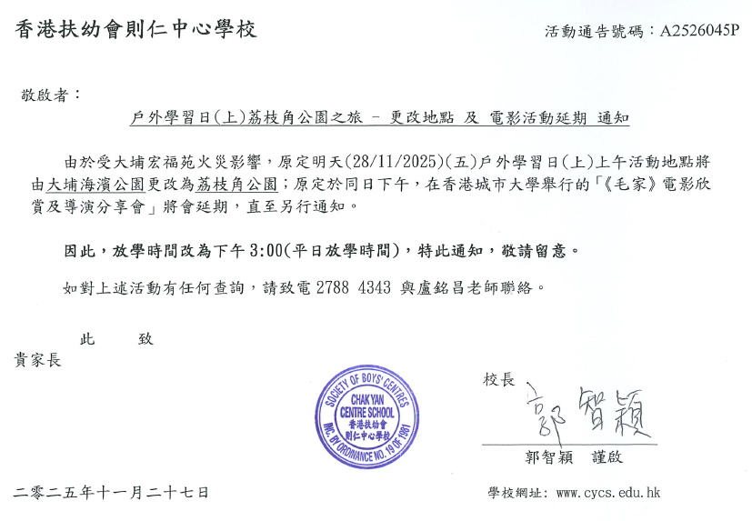 戶外學習日(上)荔枝角公園之旅 - 更改地點 及 電影活動延期 通知